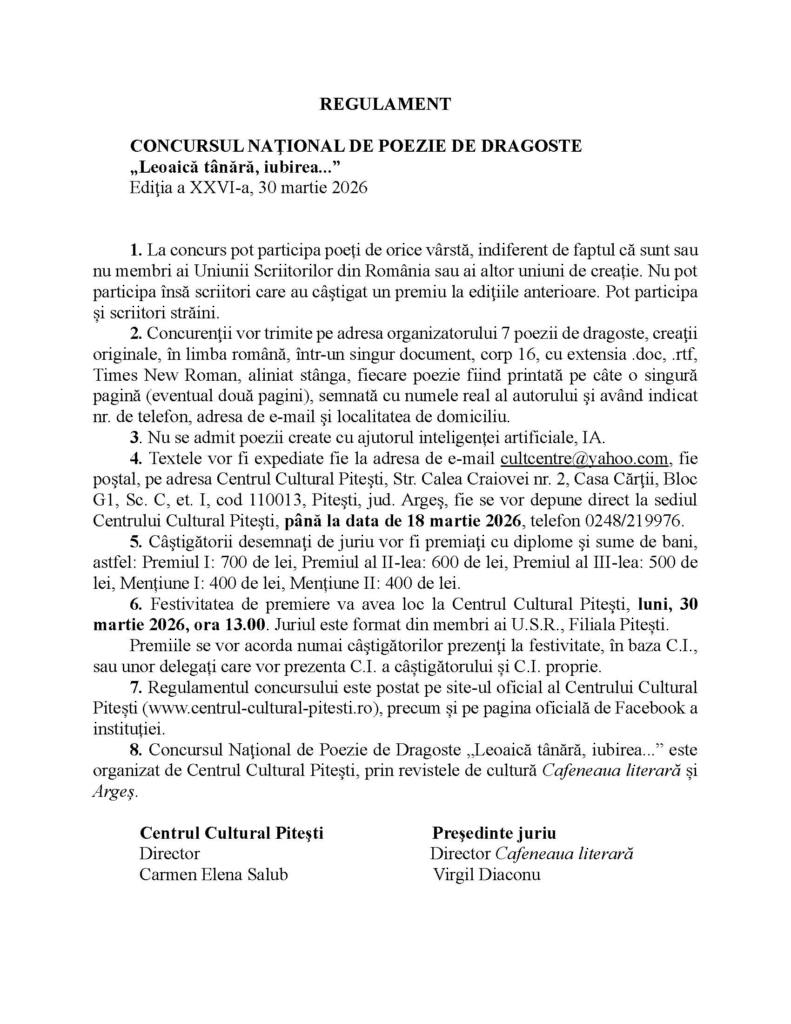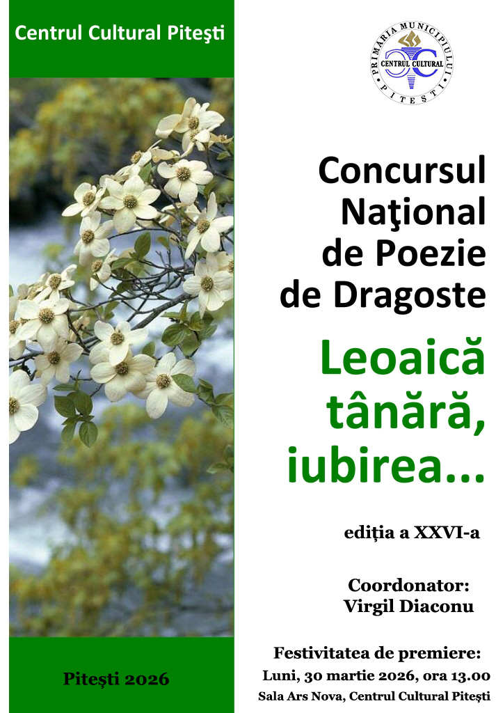 Centrul Cultural Pitești, prin revistele de cultură Cafeneaua literară și Argeș, organizează ediția a XXVI-a a Concursului Național de Poezie de Dragoste „Leoaică tânără, iubirea…”, în perioada 24 februarie – 30 martie 2026. Potrivit regulamentului, la concurs pot participa poeți de orice vârstă, indiferent de faptul că sunt sau nu membri ai Uniunii Scriitorilor din România sau ai altor uniuni de creație. Nu pot participa însă scriitori care au câştigat un premiu la ediţiile anterioare. Pot participa și scriitori străini. Concurenţii vor trimite pe adresa organizatorului 7 poezii de dragoste, creaţii originale, în limba română, semnate cu numele real al autorului şi având indicat nr. de telefon, adresa de e-mail şi localitatea de domiciliu. Nu se admit poezii create cu ajutorul inteligenței artificiale, IA. Textele vor fi expediate fie la adresa de e-mail cultcentre@yahoo.com, fie poştal pe adresa Centrul Cultural Piteşti, Str. Calea Craiovei nr. 2, Casa Cărţii, Bloc G1, Sc. C, et. I, cod 110013, Piteşti, jud. Argeş, fie se vor depune direct la sediul Centrului Cultural Piteşti, până la data de 18 martie 2026, telefon 0248/ 219976. Festivitatea de premiere va avea loc la Centrul Cultural Piteşti, luni, 30 martie 2026, de la ora 13.00. Juriul este format din membri ai U.S.R., Filiala Pitești. Regulamentul concursului este postat pe site-ul oficial al Centrului Cultural Pitești (www.centrul-cultural-pitesti.ro), precum și pe pagina oficială de Facebook a instituției.